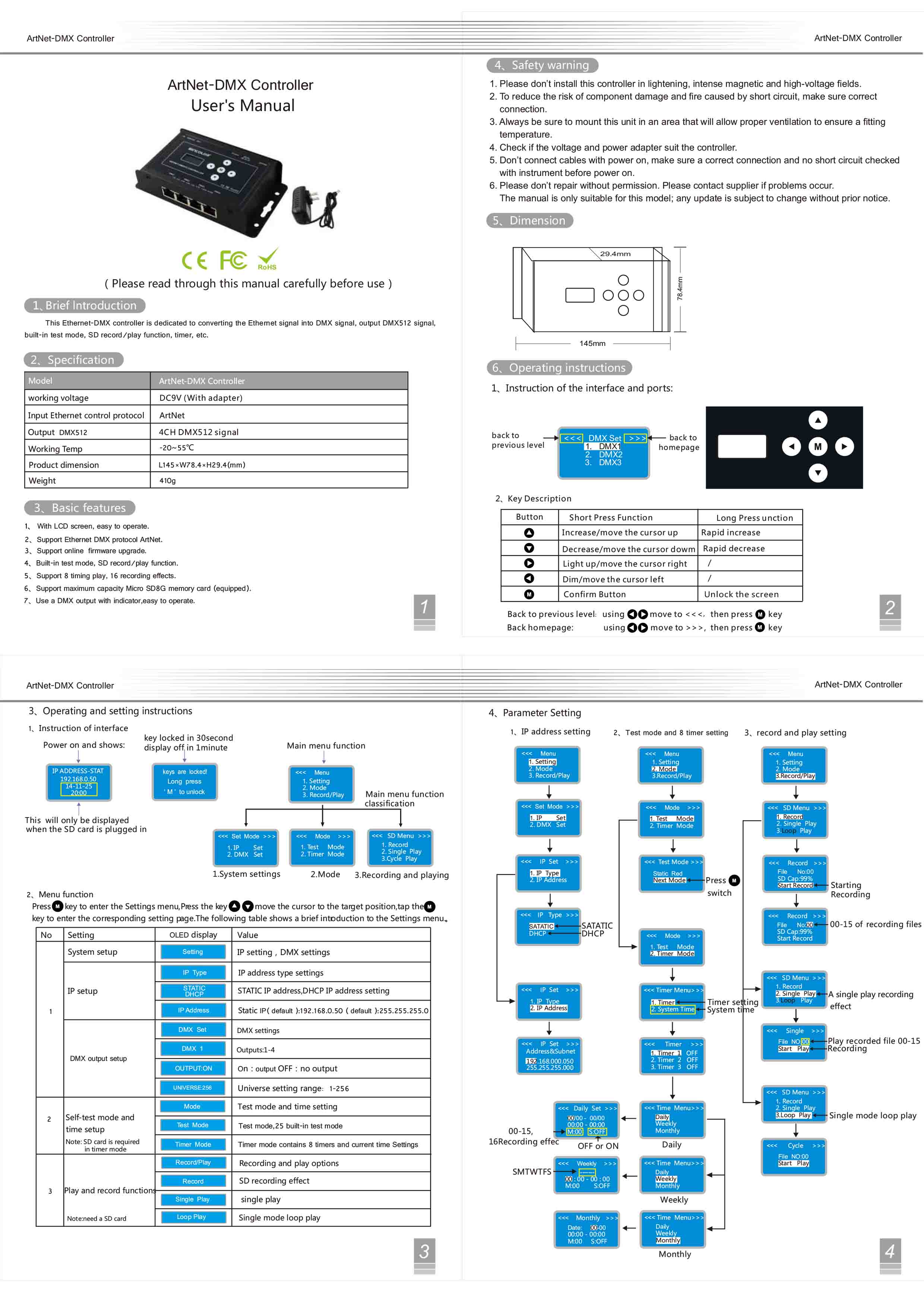 This ArtNet-DMX controller is dedicated to converting the Ethernet signal into DMX signal, output DMX512 signal, built-in test mode, SD record/play function, timer, etc.